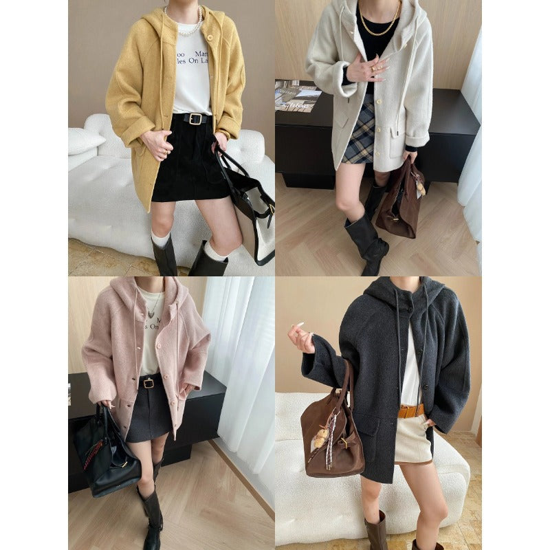 South Compass Gentle Encounter Petite Oversized Hooded Drawstring Silk Wool Reversible Cashmere Coat